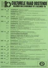 Formaa : 42 x 30 cm. 20/11: Voordracht: "Esperanto en Toerisme" door marc Cuffez. Voordracht: "Nabuco" door Rik Brys. Theater: "Oleanna" door "Antigone". 21/11: Cursus: "Video voor beginners". Voordracht: "Omgaan met gehandicapte/zieke mensen" en "Lijden: zin en onzin" door Jean-Pierre Goetghebeur. 22/11: Voordracht: "De Koninklijke Schenking" door Frans Guillaume. Voordracht: "Relatie van de Kunst en Cultuur" door Bart Vonck. Cursus: "Een musikale stijlleer" door Herman Van Cauwenberghe. Theater: "Een vloog over het koekoeksnest". 23/11: Poppentheater Craebelleman en onthaal Sinterklaas. Live-uitvoering pianomuziek. Viering 50 jaar K.W.B. ST.-JAN met intervieuws, diamontage, tentoonstelling en drink. Theater "Wolven huilen" door "De Korre". 25/11: Voordracht: "Positie en identiteit van Vlaanderen als Europese regio" door J. Vandemeulebroucke. Voordracht: "Malta" door dhr. en mevr. Van Daele. 26/11: Reeks: "Verschillende aspecten van de media, D&D Communications". 29/11: Theater: "De Misantroop" door Mal du sciècle". 30/11: Theater: "Pallaksch, Pallaksch, Pallaksch" door "Kollektief D&A". 1/12: Geleid bezoek tentoonstelling: "Van Ensor tot Delvaux". 3/12: Voordracht: "De nierfunctie".