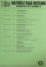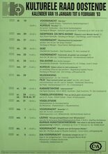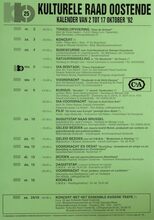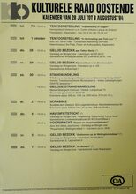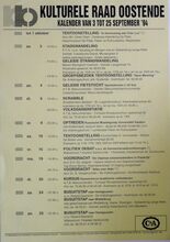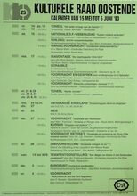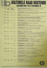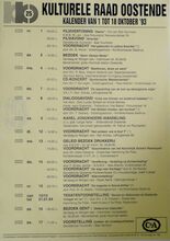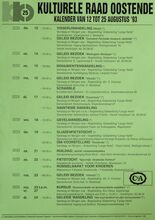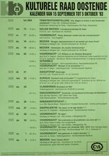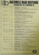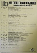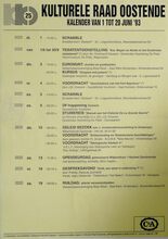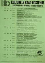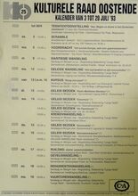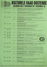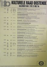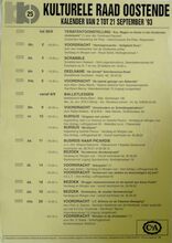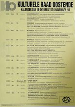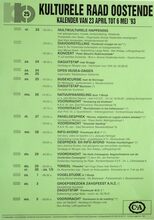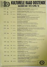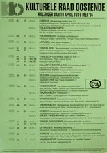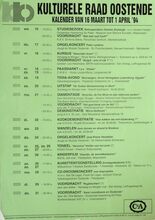 18/03: Voordracht: "Kunst en Kitsch" door P. Lisabeth. 18/03, 20/03 tot 26/03: Toneel: "Prosper". 19/03: Kruidencursus door Annie Vanbranteghem. 20/03: Jaarlijks vredessouper door Bob Paulus. 21/03: Daguitstap naar het Zwin. 22/03: Voordracht: "Het fumdamentalisme in de Islam" door prof. dr. U. Vermeulen. Orgelconcert door P. Ledaine. 24/03: Gespreks- en info-avond: "Ons onderwijsnetwerk". door Nadine Callens. 25/03: Voordracht: "oostende op Testerep en het West-Vrije (700-1267) door dhr. Roger Van Der Heyde. 25/03, 26/03 en 27/03: Toneelopvoering: "The Big Bad Mouse". van King en Cary. 27/03: Bezoek tentoonstelling: "100 jaar stedelijke musea" o.l.v. dhr. Norbert Hostyn. 28/03: Visserijwandeling-West. 29/03: Voordracht: "Mysterieus Bali" door mevr. E. Vandecasteele. Orgelconcert door J.P. Hautekiet. 30/03: Dagreis Diksmuide. 1/04: Muziekkring. 3/04: Bezoek Duinenkerkje o.l.v. dhr. Jaen-Pierre Falise. Panelgesprek: "Wat met het impulsiefgebied Oostende." met Luc Huysentruit, Jacky Maes en Johan van de Lanotte.