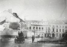 Formaat : 13 x 18 cm.Β - Links de afbraak van de huizenrij die moest plaatsmaken voor de bouw van de Sint Petrus en Pauluskerk in 1899. Het gebouw centraal op de foto, o de hoek van de Pastoor Pypestraat en het Sint-Petrus en Paulusplein was de Vrije Visserijschool Paster Pype. Op dezelfde plaats werd tijdens het Interbellum de "El Mar" gebouwd.