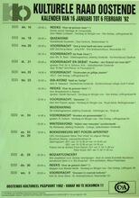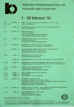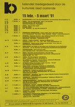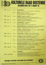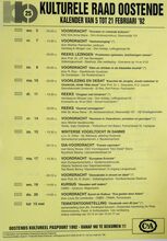 Formaat : 42 x 30 cm. 5/02: Voordracht: "Vrouwen in vreemde culturen". 7/02: Voordracht: "Voetverzorging" door Martine Parmentier. Reeks lezingen: "Problemen oplossen, beslissingen nemen" door prof. dr. J.P. Van Bendeghem. 8/02: Voordracht: "Eten en drinken in de klassieke muziek" door R. Brys. 10/02: Voorlezing en debat: "Ezechiel de Jonghe, Joods makelaar in Oostende, einde 18 eeuw." door prof. dr. L. Dequeker. 11/02: Reeks: "Omgaan met kinderen". Reeks: "Gezond vermageren". 14/02: Voordracht: "Racisme in Vlaanderen, oorzaken en gevolgen." door Michiel Vandevoorde. 15/02: Winterse vogeltocht in Damme. Dia-voordracht: "Franse capriolen". Met Henry Roose. 17/02: Voordracht: "Europese Evolutie" door J. Vandemeulebroucke. Voordracht: "Democratie in droom en daad" door prof. dr. R. Doom. 19/02: Cursus: "Sieraden zelf maken". 20/02: Voordracht kunst encultuur: "Eva gezien door Adam. door Louis De Lentdecker. tot 15 mei: Temtentoonstelling: "Oostende voor 80 jaar." door dhr. Ferdinand Gevaert.