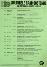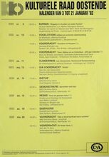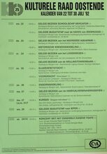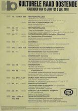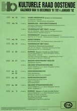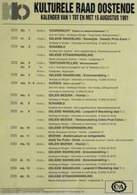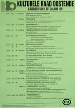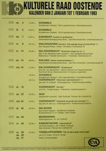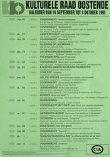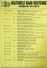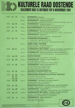 Formaat : 42 x 30 cm. 24/10: Jubileumviering 25 jaar kulturele raad Oostende (uitgebreid programma). 15/10 tot 15/01/1993: Thematentoonstelling: Porselein uit Oostendse huiskamer, door mevr. S. Maes. 15/10: Daguitstap. Voordracht: Fruit: plukken, bewaren en variΓ«teiten. Toneel: Reynaert de Vos. 16/10: Kookles. 17/10: Treinuitstap: Migranten in Gent. Ruildag bizar-bizar. Geleide strandwandeling. Voordracht: Amerikaanse strijdliederen, door dhr. Roger Vens. 19/10: Dia- voordracht over IndonesiΓ«: de gordel van smaragd, door dhr. M. Van Hecke. Scrabble. Voordracht: Bestaat er nog een derde Wereld? 20/10: Reeks: schaduwborduren. 21/10: Voordracht: beeld van de vrouw in de jeugdliteratuur, Marita De Sterck. Herfstviering: grenzen doorbreken. 22/10: Voordracht: Dromen, door Ann Delye.