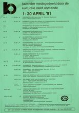 Formaat : 49 x 35 cm. 1/04: Tentoonstelling: spoor- expo '91. 2/04: Scrabble. 3/04: Fietstocht voor 50- plussers. 8/04: Voordracht en demonstratie: zomer- make- up. 11/04: Geleid bezoek aan de Oostendse beiaard. 12/04: Gespreksavond: een avond met.... auteur- journalist Jos Vandeloo. 13/04: Kindertheater Perotto brengt: Kotterie Flamand. Wandelwandelvoordracht: op de laagwaterlijn. 15/04: Gesprekavond: staat jouw man ook nooit op de foto? 16/04: Lessenreeks Spaanse volksdansen. Voordracht: hoe reuma kraken, door prof S. Orloff. 20/04: Gezellige avond. dia- avond: China- een diadagboek- Vokaal kwartet 'Touchant'. Tot 15juni: Thematentoonstelling: Briefhoofden als image- building object, door dhr. W. Major. 20 en 21 april: Opendeurdagen Oostendse musea.
