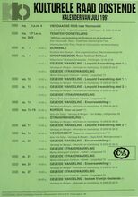Formaat : 42 x30 cm. 1tot4/07: Vierdaagse reis NormandiΓ«. 1/07 tot 30/09: Thematentoonstelling: Affiches met betrekking tot Oostende en de kuststreek, door mvr. S. Maes. 2/07: Scrabble. 6/07: Groepsbezoek Rock- festival Torhout. Geleide Wandeling: Leopold II- wandeling deel1. Geleide strandwandeling. 10/07: Geleide wandeling: Leopold II- wandeling deel 1. 13/07: Geleide wandeling: Leopold II- wandeling deel2. Geleide strandwandeling. 14/07: Geleide wandeling: Enzorwandeling. 15-19/07: Cursus: Zeker van jezelf. Strandwandeling. 17/07: Geleide wandeling: Leopold II- wandeling deel 2. 18/07: Voordracht: Slapen en slaapmoeilijkheden. 20/07: Geleide wandeling: Ensorwandeling. Geleide strandwandeling. 21/07: Geleide strandwandeling. 24/07: Geleide wandeling: Ensorwandeling. 27/07: Geleide strandwandeling. Geleide wandeling: bezoek Vismijn Oostende.