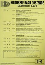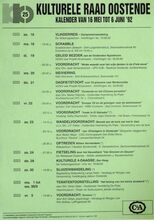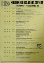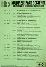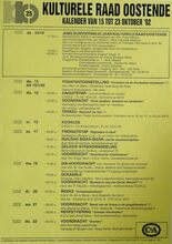 Formaat: 42 x 30 cm. 24/10: Jubileumviering 25 jaar kulturele raad Oostende. 23/10: Cursus: Kruiden, door Annie Vanbranteghem. 24-25/10: Fotosalon. 25/10: Paddestoelenwandeling: Vloetemveld. 27/10: Gespreks- en info-avond: echtscheiding. Belangstellingswerking: begin je te vergeten? 29/10: Voordracht: PI. Tshaikowsky, door dhr. Rik Brys. Voordracht: de Sabena te Oostende, door dhr. Walter Major. 31/10: Geleide strandwandeling. Pop- en- theater: Repelsteel Uitgespookt. 3/11: Scrabble. Cursus: Filosofie, door Raf Debaene. 5/10: Ruildag Euromunt: munten en postkaarten. Cursus: Geschiedenis van Oostende.