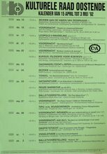 Formaat : 42 x 30 cm. 1/04: Voordracht: "Zenuwen en depressies, ware oorzaken en gezonde natuurlijke behandeling." 3/04: Toneelvoorstelling: "Tsjip" naar W. Elsschot door A. Willequet. 4/04: Geleide strandwandeling. Scrabble. PoΓ«zie-avond. "Dichters zijn ook maar mensen" met Rita LommΓ©e. 5/04: Geleid bezoek aan het schoolschip "Mercator". 6/04: Dia-montage: "IsraΓ«l" door dhr. A. Haesaert. 7/04: Voordracht: "Sportsclub investeren in jeugd". door prof. P. De Knop. 8/04: Dia-voorstelling: "Oostende, koningin der badsteden?". 10/04: Leopold II-wandeling. 11/04: Ensorwandeling: " In de voetsporen van James Ensor". 12/04: Historische krekenwandeling. 13/04: Bezoek aan de vismijn. Voorlezing en debat: "Avenoe, over de Joodse achtergronden van het Onze Vader. door E.H. A. Van Collie.14/04: Stadskernpromenade: "Oostende bij avond". 15/04: Beozke aan de havan van Zeebrugge. 16/04: Voordracht: "Slaap en slaapmoeilijkheden". door Ann Delye. 17/04: Leopold II-wandeling deel 2.