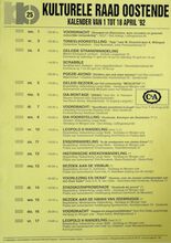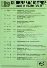 Formaat : 42 x 30 cm. 16/03: Voordracht: "Actie tege geweldpleging" door de heer R. Clauwaert. 21/03: Samenkomst leden en sympatisanten met toespraak. 22/03: Ruilbeurs - Treinclub Stephenson vzw. Snoeidemonstratie van groot fruit. 23/03: Voordracht: "Terug naar een Ijstijd?" (met dia's) door prof. dr. R. Paepe. 24/03: Reeks "Tussen Boeken" Jaen Surmont over Willem Elsschot. 25/03: Demonstratie: EΓ©npansgerecht. 26/03: Muziekkring. Voordracht: "Vorming en Bewoningsgeschiedenis op de kust van maritiem Vlaanderen" door de heer Johan Termote. 27/03: Voordracht: "Rouw en Rouwverwerking" door Adelin Verslyppe. 27/03, 28/03 en 29/03: Tentoonstelling "De Eenzame Moordenaar" van Eddy De Vries. 29/03: Busexcursie: de braakman en de kreken onder de "Dullaert". 30/03: Voordracht "Kenia" door de heer F. De Leger. 1/04: Voordracht: "Zenuwen en Depressies, ware oorzaken en gezonde natuurlijke behandeling. 3/04: Toneelvoorstelling "Tsjip" naar W. Elsschot door A. Willequet. 5/04: Geleid Bezoek aan het schoolschip "Mercator" begeleiding: Gidsenkring Lange Nelle.