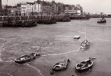 Het Montgomerydok is bevroren,rechts Visserskaai en -plein.Waar het paalwerk staat,komt de garnaalmijn.