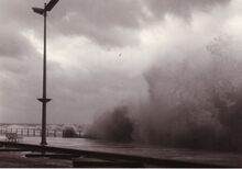 Overslaande golven aan de Albert I Promenade bij stormweer.Er is al een (laag) stormmurtje en riolering aanwezig.