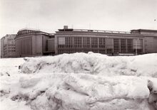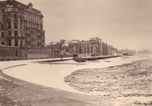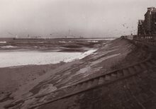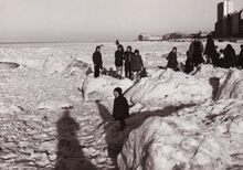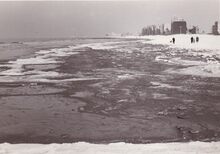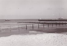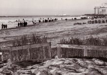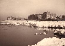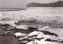 HetΒ GrootΒ Strand bedolven onder sneeuw en ijs. Op de achtergrond, het vierde Kursaal