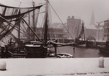 Het Montgomerydok en Visserskaai onder de sneeuw.Op de achtergrond het Vissersplein.