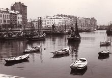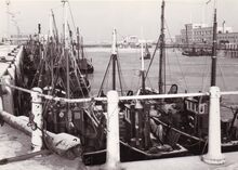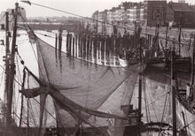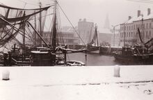 Het Montgomerydok is bevroren,rechts Visserskaai en -plein.Waar het paalwerk staat,komt de garnaalmijn.