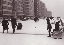 Zicht van aan de kursaal richting Mariakerke op de Albert I Promenade en het strand onder de sneeuw.Er is nog veel puin en ruines uit de tweede wereldoorlog.