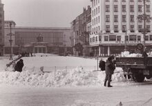 De Leopold II-laan en het Marie-Joseplein onder de sneeuw tijdens de kerstperiode. Rechts het gekendeΒ "Hotel du Parc"Β .Mannen van de stedelijke reinigingsdienst ruimen sneeuw.