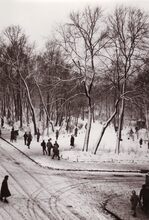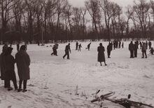 Formaat : 13 x 18 cm. -Winterpret op de bevroren vijver van het Maria-Hendrikapark. Rechts de wielerpiste en op de achtergrond de Iependreef.