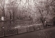 Winter in het Leopoldpark. De vijver is dichtgevroren.