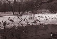 Formaat : 13 x 18 cm. - Het ondergesneeuwde Leopoldpark. Meeuwen op zoek naar voedsel. Op de achtergrond de Leon Spilliaertstraat.