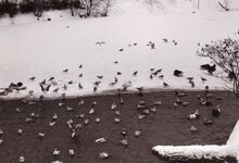 Véél meeuwen en enkele eenden en ganzen in een winters Leopoldpark.