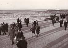 Talrijke kijkers op het strand die het uniek schouwspel van de bevroren zeeΒ komen bewonderen.