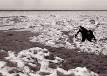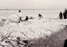 Enkele oudere vissers (?) bekijken en bespreken de situatie van op het strand dat onder sneeuwen ijs ligt.