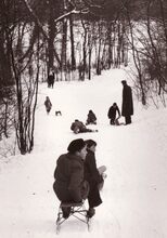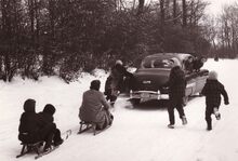 Formaat : 13 x 18 cm. - Sleetje rijden met de hulp van een wagen in de Koninginnelaan