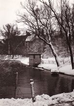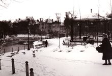 Formaat : 18 x 13 cm. - Winter in het Leopoldpark, op de achtergrond de Euphrosina Beernaertstraat. Het gebouwtje was de kassa van de plezierbootjes.