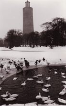 Formaat : 18 x 13 cm. - Maria-Hendrikapark: talrijke eenden in een wak op de bevroren vijver ter hoogte van de nieuwe watertoren.