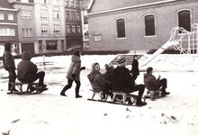 Formaat : 13 x 18 cm. - Kinderen genieten van de winterpret op het speelplein aan het Mijnplein bij de Kapucijnenkerk. Links de Kapucijnenstraat.
