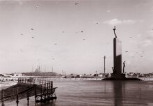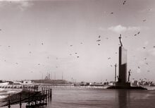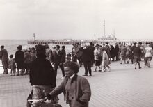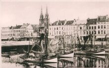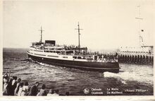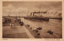 De pakketboot Stad Antwerpen verlaat de haven van Oostende op weg naar Dover. - Links, het Weststaketsel. Met een jol kon je de Oosteroever bereiken. Meestal bemand door vissers op rust om een frank bij te verdienen. Op de achtergrond, het Ooststaketsel.