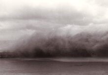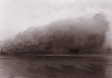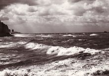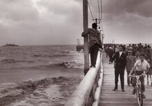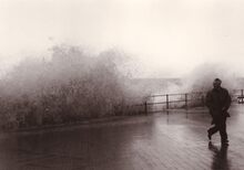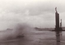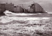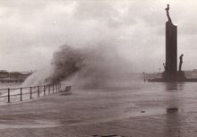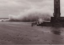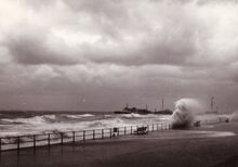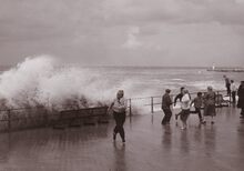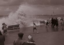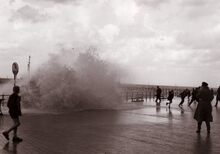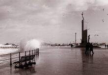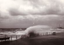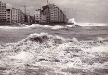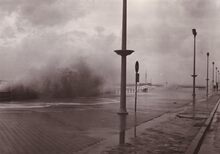De Albert I Promenade tijdens stormweer,het water slaat over en er is nog niets te zien van stormriolering (of muurtje).