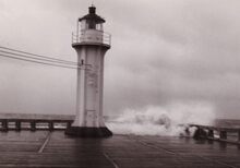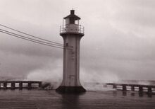 Het torentje met de mistbelΒ op het uiteinde van het Weststaketsel (koptje van 't hoofd) bij stormweer.
