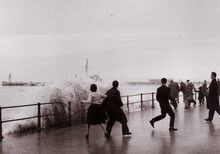 De Albert I Promenade bij stormweer,een ferry steekt in zee.