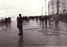 Er is grote belangstelling (als steeds) voor het spektakel van het overslaand water op de Albert I Promenade.Achteraan de Vlaanderenramp.Nogal wat schade aan de betegeling van de zeedijk.