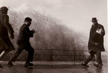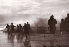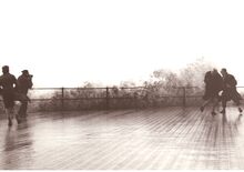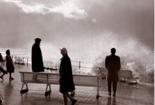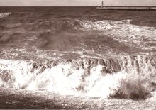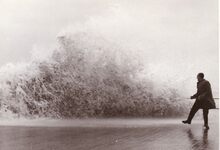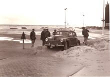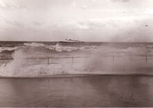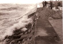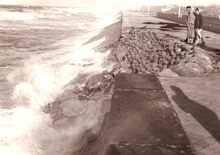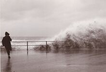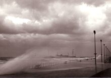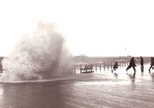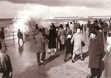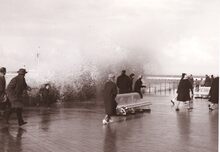 Opspattend water aan de Albert I Promenade bij een flinke bries en hoog tij.Wandelaars genieten van dit nu helaas verdwenen schouwspel.