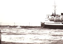 De ferry "Koningin Astrid" heeft het lastig in de havengeul bij stormweer,en heeft haar anker moeten laten vallen om te kunnen maneuvreren.