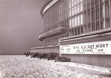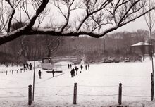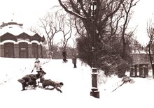 Een besneeuwd Leopoldpark,de jeugd geniet vanzelfsprekend ! Het gebouw is dit van de bron van mineraal water die er toen stond.