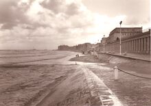Het strand voor het Thermae Hotel bij extreem hoog tij (springtij ?) en stormachtig weer.