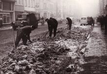 Mannen van de stedelijke reinigingsdienst ruimen sneeuw in de Alfons Pieterslaan. De straathoek achter de vrachtwagen links is deze met de Jules Puerquaetstraat, met zicht op cafΓ© In de Pelikaan.