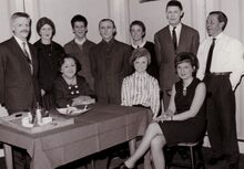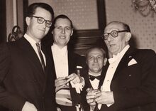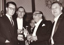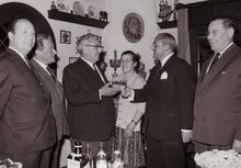 Frits CONTENT, voorzitter van het "Conservatoriumtoneel" overhandigt een afscheidscadeau aan Maurice DE BUSSCHERE, inspecteur van de Schouwburg. Tussen hen in mevrouw DE BUSSCHERE. Links staat John HERMANS, gemeenteraadslid en journalist. Ook aanwezig de heren O. DEFOOR en DIERICKX.