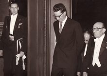 Formaat : 13 x 18 cm. - Koning Boudewijn woonde de slotvoorstelling bij van het Koninklijk Landjuweel in de Koninklijke Schouwburg (Van Iseghemlaan). Naast hem, burgemeester Jan Piers en de voorzitter van de jury Paul Van Aerden