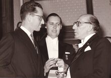 Formaat : 13 x 18 cm. - Koning Boudewijn in gesprek met de voorzitter van het Koninklijk Landjuweel Paul Van Aerden.Tussen hen, burgemeester Jan Piers. De voorstellingen gingen door in de Koninklijke Schouwburg (Van Iseghemlaan). De koning woonde de slotvoorstelling bij op 30/01/1960