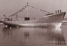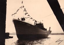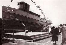Loodsboot 5 is klaar voor de stapelloop. Centraal minister Paul-Willem Segers, rechts van hem, burgemeester Hendrik Serruys, helemaal rechts, Roger De Kinder, schepen.
