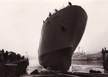 De O.164 "Victor Seghers" glijdt de helling af in het Visserijdok. Stalen hektreiler gebouwd op de scheepswerf Seghers voor de NV Polaris.