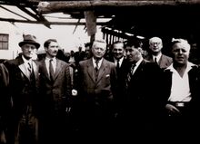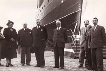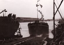 Een tewaterlating in het derde, thans verdwenen, handelsdok. Van links naar rechts Henri EDEBAU, Roger DE KINDER, Emiel VROOME, onbekend, Richard PANESI (scheepsbouwer), Michel SURMONT en onbekend.Β