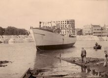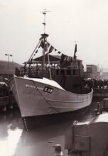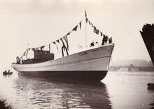Zwaaidok. De O. 305 "FranΓ§ois Musin" kort na zijn tewaterlating opΒ de werf van Beliard-Crighton & CΒ°. Stalen motortreiler gebouwd voor rekening van de NV Motorvisserij.