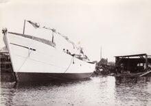 De Z.565 "Narwal" gaat het Zwaaidok in aan de scheepswerf Beliard-Murdoch. Rechts op de achtergrond enkele marineschepen. De stalen hektreiler was ook een fabriekschipΒ en vriestreiler en werd gebouwd voor de rederijΒ NV Maatschappij voor Hoogzeevisserij (Brugge).