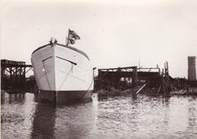 Het Zwaaidok. De O. 236 "Henriette" is zopas te water gelaten van op de werf Beliard-Crighton & CΒ°. Stalen motortreiler gebouwd voor reder Henri Laplasse.