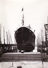 De O.319 "Noordende II" op de helling voor de tewaterlating bij de scheepswerf Beliard-Crighton & CΒ°. Stalen motortreiler gebouwd voor de rederij Noordende.