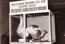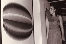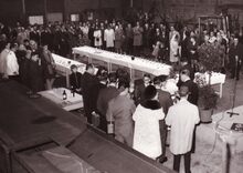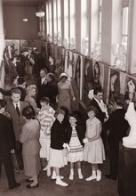 Bezoekers van een tentoonstelling van o.a. beeldhouwwerken in het kursaal.