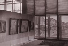Een tentoonstelling in het kursaal.Zicht op het groot strand door de ramen.