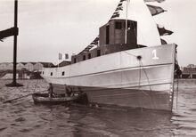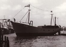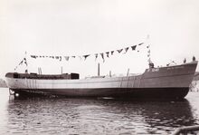 De O.307 "Verdi" na haar tewaterlating. Stalen motortreiler gebouwd op de werf J. Deweert voor rekening van PVBA De Noordzee.